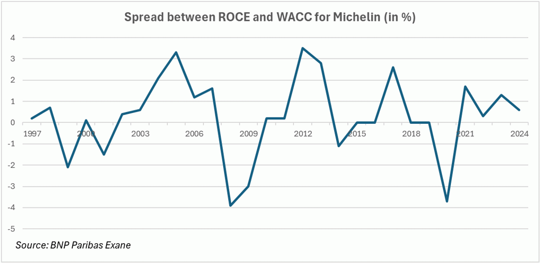 Admittedly, Michelin's estimated operating profit in 2025 may seem very high at €3,183m. But after tax at an average rate of 24% and on operating assets of €26bn, this gives an economic profitability of 9.1%, which is more or less equal to its current cost of capital of 9.3%.