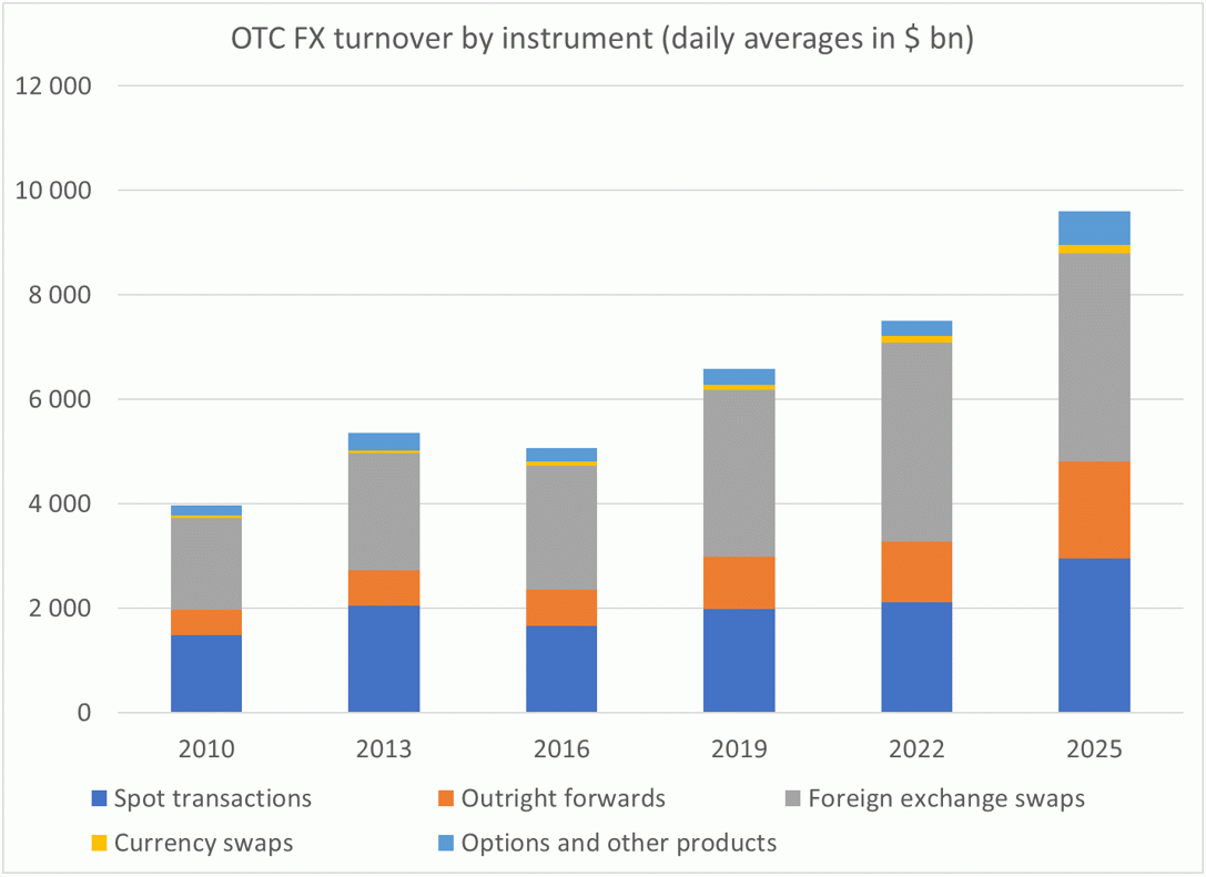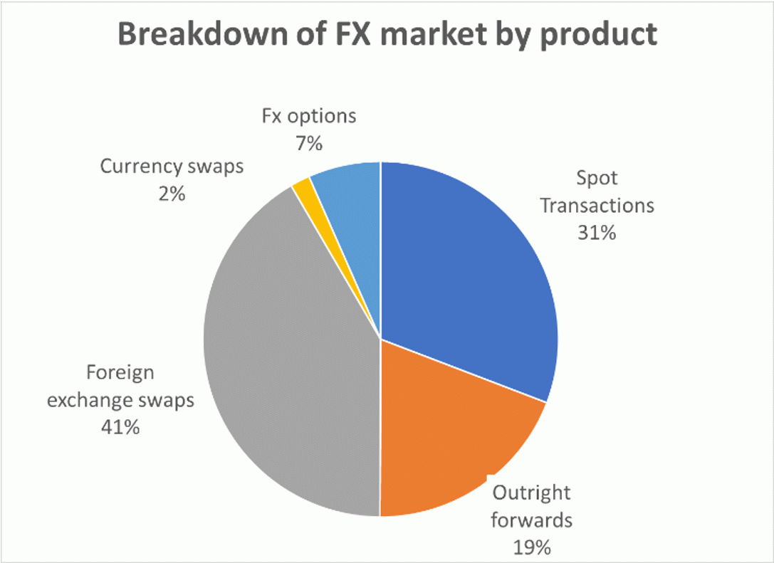 FX swaps represent the majority of the volumes with spot transactions accounting only for 31%.