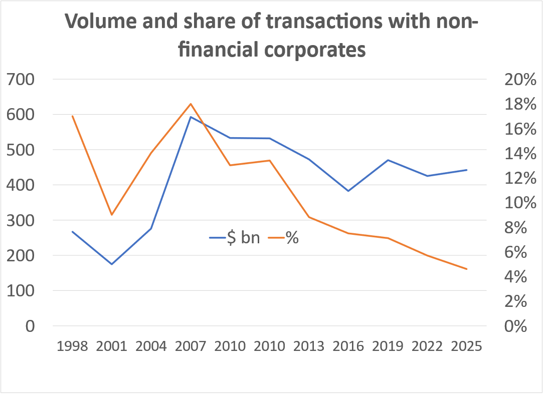 The volumes traded by corporates are relatively stable in absolute terms but their share has been decreasing since 2007 and represents now less than 5% of daily global volumes: