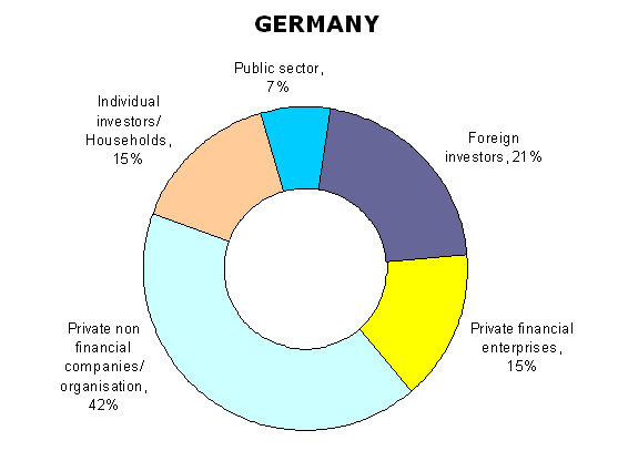 Covering 26 countries, it shows that there are wide discrepancies in Europe in terms of share ownership: foreign investors own more than 50% of the share capital in small countries, around a third in the large ones, except in Germany (21%) and Italy (13%). In average private local investors directly through holding companies control a third of the shares, another third being held by banks, insurance companies and funds.