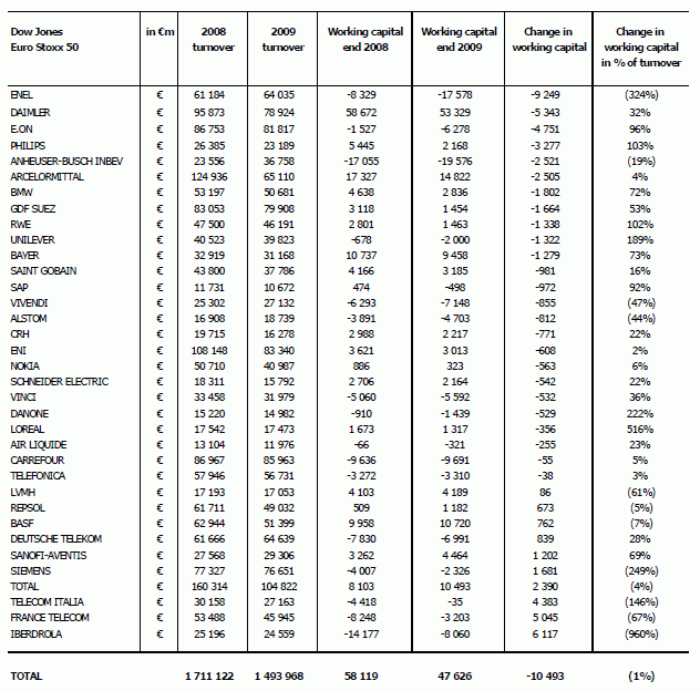 - 17 of the 35 non financial / real estate members of the Euro Stoxx 50 had negative working capital end of 2009. Negative working capital is one of the attributes of a powerful group. So no one is surprised to find that 50% of the largest Euro groups enjoy negative working capital. As we have already written (1), the level of working capital is evidence of the relative strength of a group versus its customers and its suppliers. Food retail is not the only sector to have a negative working capital! Working capital for top European groups is now down to 7 days of sales.